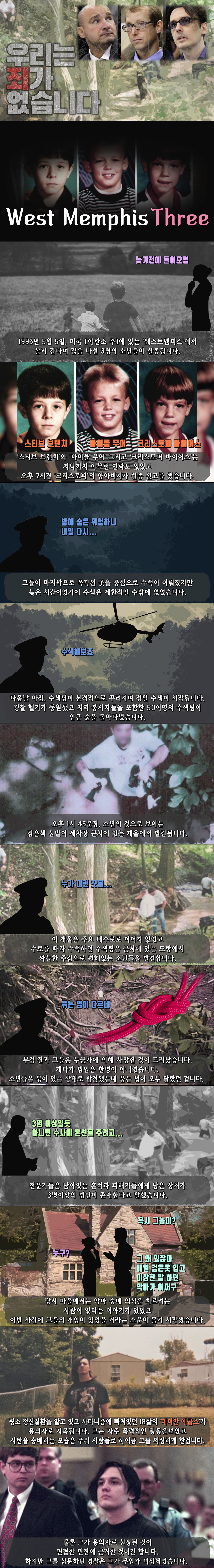 1993년 5월 5일, 미국 [아칸소 주]에 있는 ‘웨스트멤피스’에서 놀러 간다며 집을 나선 3명의 소년들이 실종됩니다.