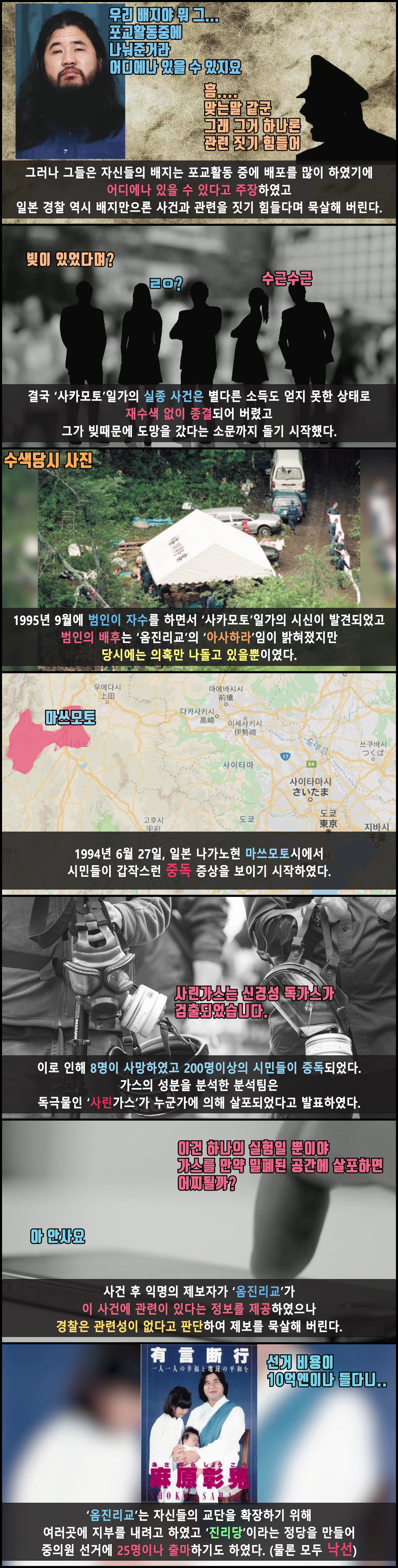 1995년 9월에 범인이 자수를 하면서 ‘사카모토’일가의 시신이 발견되었고 범인의 배후는 ‘옴진리교’의 ‘아사하라’임이 밝혀졌지만 당시에는 의혹만 나돌고 있을뿐이였다.